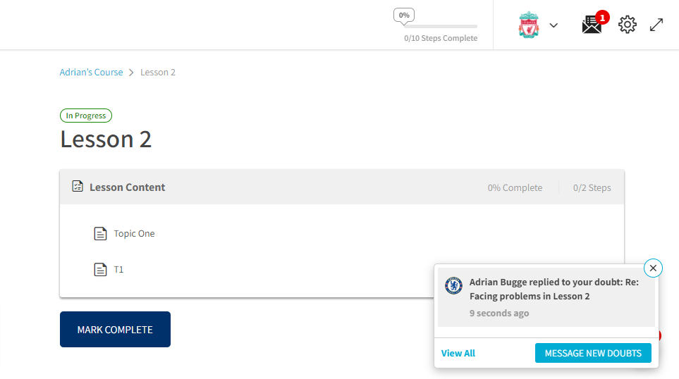 Users can then View the instructors reply and continue the conversation from the lesson/topic page itself.