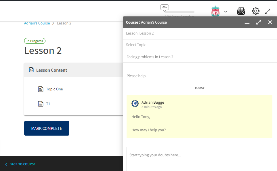 Once you have all the settings properly configured, the students will be able to communicate with the course instructors for any course lesson or topic from the lesson or topic page itself.