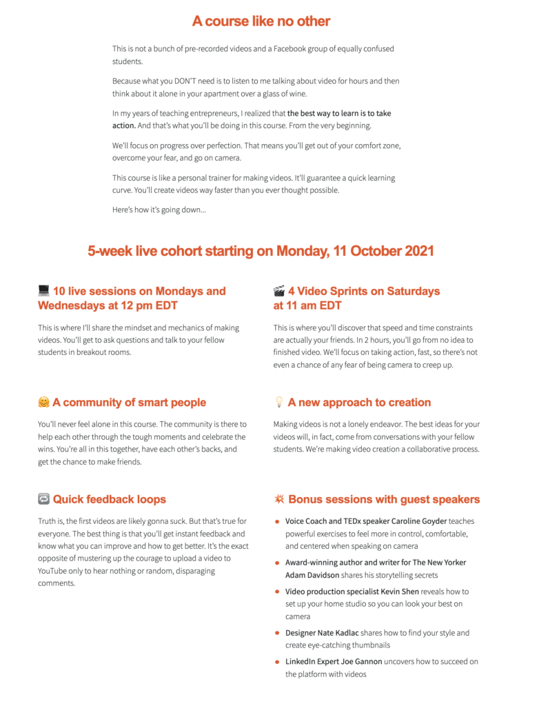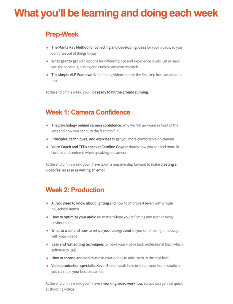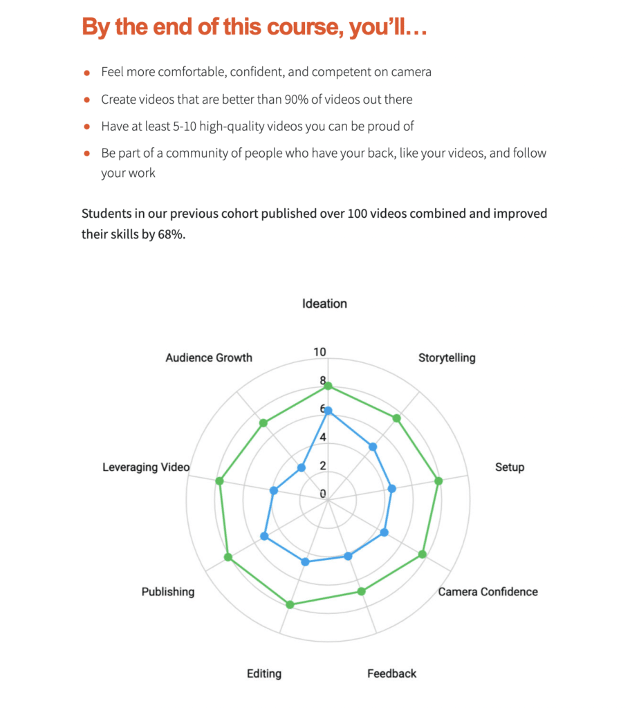 My favorite line on this whole page is the data-driven articulation of what you’ll learn in this course. Here is it, “Students in our previous cohort published over 100 videos combined and improved their skills by 68%.“