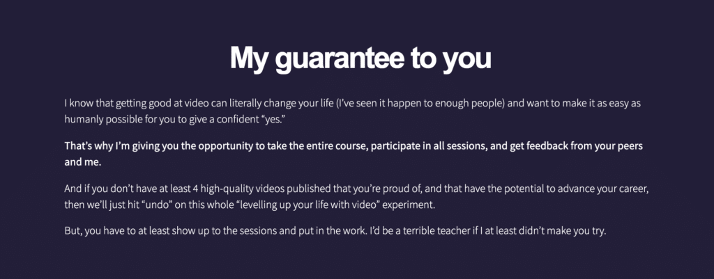 This is the kind of “money back guarantee” that I recommend to anyone I’m talking to about selling a course. It’s the “you have to show me you attended and put in the work, and if you’re still unsatisfied…” kind of approach.