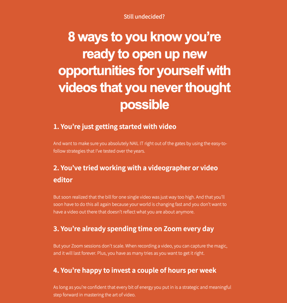 A section I don’t see enough on sales pages is this “how to know if you’re ready” kind of page. It’s an easy way to let prospects qualify and disqualify themselves without a lot of effort.