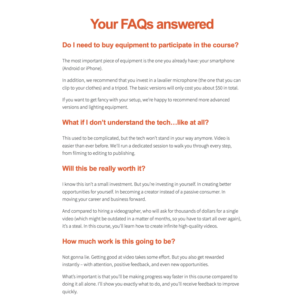 The final section before another “enroll” now section, which is available in several places on the page, is the FAQ section. The biggest benefit to how these FAQs are designed is that they’re shaped to mitigate the most common reasons people stop themselves from buying the course.