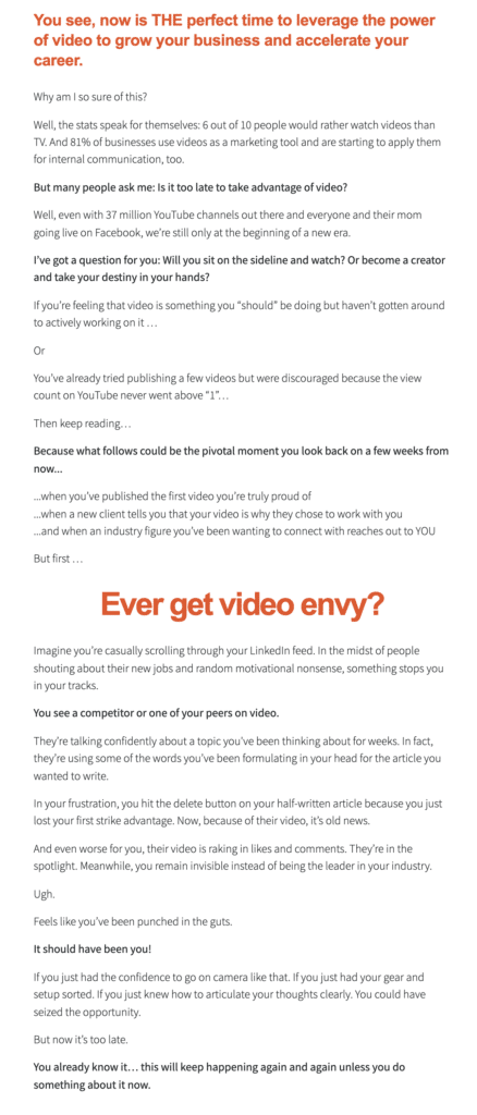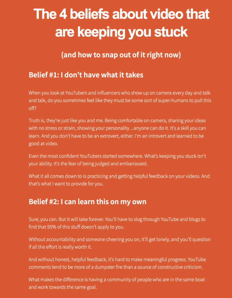 Now, in this next section, Cam isn’t dealing with the buying challenges. He’s not working past your initial conflict over whether to sign up. Instead, he’s directly attacking the challenges you have with the problem his course is solving.