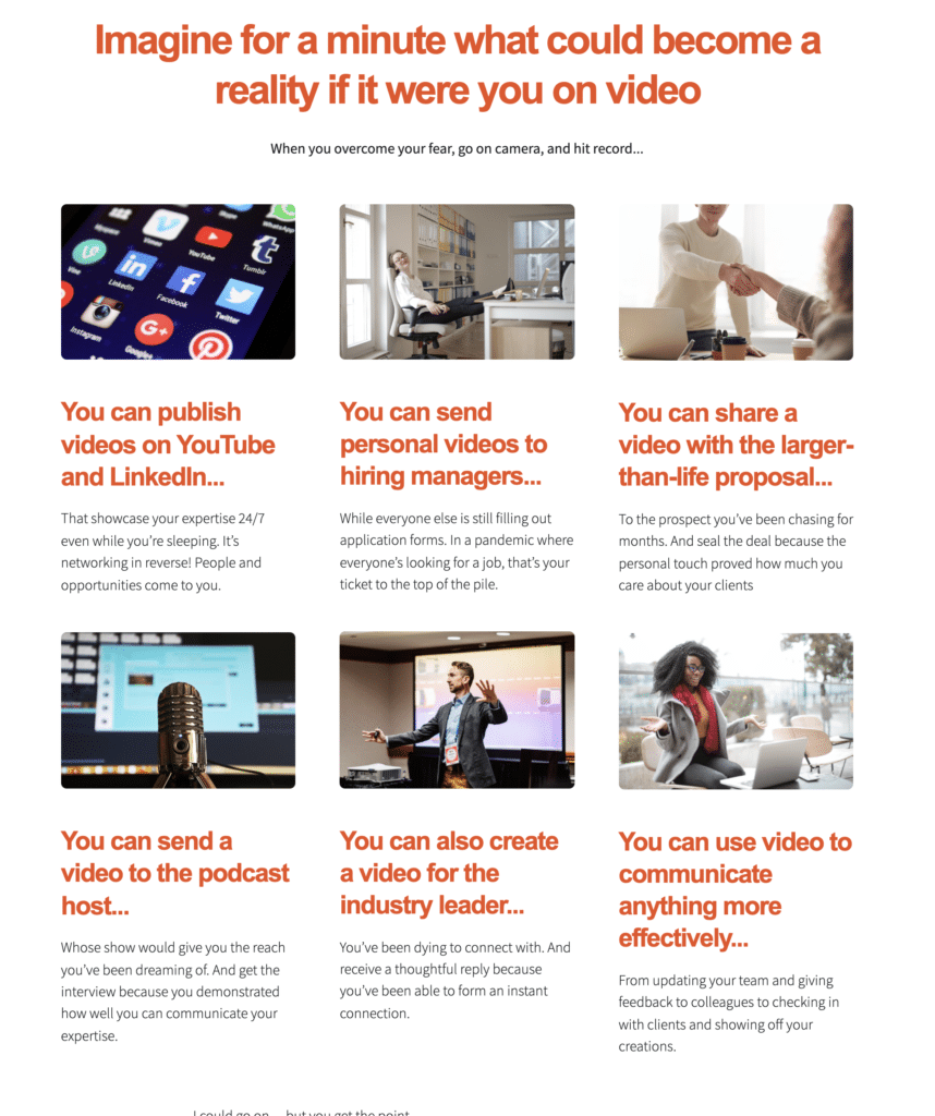 What I love about this next section is that they are all benefits but done as imagine statements. What could you do and accomplish, if you were comfortable doing XX? Let me list all the ways.