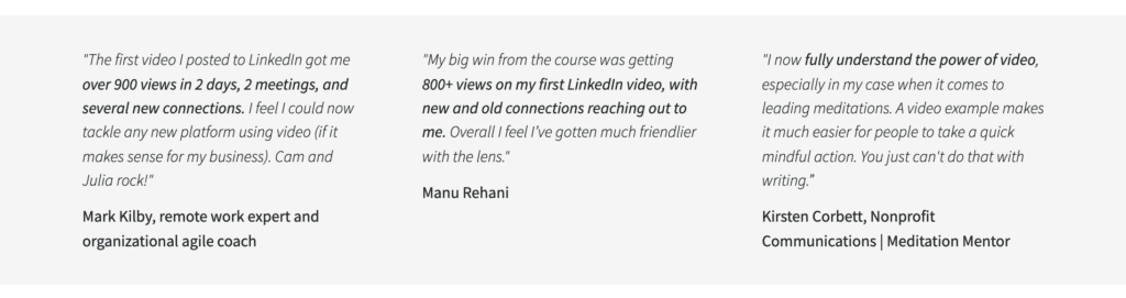 I’ve told you how important testimonials are. Well, you’ll see them here doing a superb job of convincing you to sign up for the course.